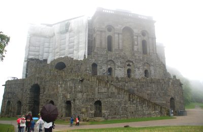 Fotografowanie ich jest bardzo utrudnione, gdyż ze względów bezpieczeństwa zasłonięte są przez stalowe siatki. Ale jakoś mi się to udało. Zwiedzanie Gier Wodnych rozpoczynamy po wjechaniu na górę autokarem i wizyty w części recepcyjnej dla zwiedzających (Besucherzentrum Herkules), w którym znajdują się tablice informacyjne oraz sklep z publikacjami, napojami i pamiątkami. Prowadzić nas będzie przewodniczka. Pogoda jest dosyć fatalna, mgła częściowo zasłaniająca Herkulesa i szczyt Hektagonu, którego część jest w remoncie zakryta płachtami oraz lekka mżawka. Ale zwiedzających mnóstwo, jest wczesne niedzielne popołudnie. Przeciskając się przez tłum schodzimy kamiennymi schodami na kolejne poziomy i platformy widokowe.