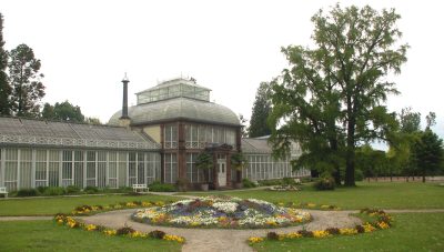 A także wiele innych małych zbiorników wodnych do których spadają niewielkie wodospady i potoczki. Wielkim, oczekiwanym przez tłum widowiskiem jest wysoki wytrysk potężnego, szerokiego strumienia wody fontanny w pobliżu zielonej łąki. Na mnie jednak największe wrażenie robią wodospady, których masy wody zaczynają nagle zwalać się w dół ze szczytu zamkowego muru stylizowanego na średniowieczną ruinę oraz pobliskich skał. Jest to bardzo atrakcyjne widowisko. Idąc w kierunku wyjścia oglądamy jeszcze i fotografujemy dużą ogrodową oranżerię oraz kwiatowy klomb przed nią. Aby zobaczyć „Gry wodne” warto tu przyjechać!