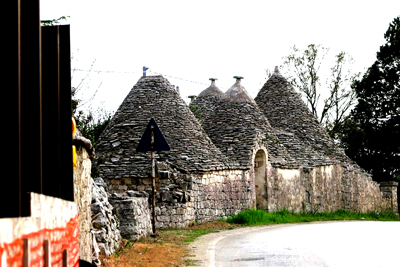 Wapienne chaty bez zaprawy – trulli – były budowane z grubo ociosanego kamienia, którego tam dostatek, jako tymczasowe schronienia i magazyny lub jako stałe mieszkania przez właścicieli ziemskich lub robotników rolnych. Pierwsze powstały już w XIII w. Jedna z hipotez mówi o zmyślności apulijskich chłopów, którym władca zakazywał budowania stałych domostw, by przenosić ich wraz z dobytkiem tam, gdzie będą potrzebni do pracy.