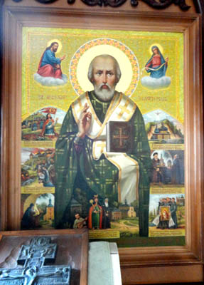 Współczesne malowidła ścienne i na stropie, a także ołtarze boczne z dominującymi w nich, dużymi ikonami świętych. Miejsce zaginionej ikony patrona, zastąpiła inna, z ciekawymi scenami z życia świętego po obu bokach jego postaci. Są też, w bogato zdobionych i złoconych ramach, innych świętych oraz dwie Matki Bożej z Dzieciątkiem.