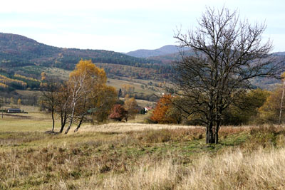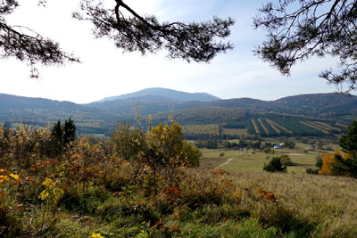 Dominuje najwyższy słowacki Busov (1002 m n.p.m.), dalej wystająca zza jego grzbietu Magura Stebnicka z przekaźnikiem TV. Nieco bardziej na północ najwyższa nasza góra – Lackowa (997 m n.p.m.) i następny w kolejności Ostry Wierch (930 m n.p.m.).