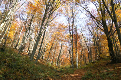 W październikowych buczynach ścieżka dość zasypana opadłymi liśćmi, ale rozpoznajemy jej przebieg dzięki wspomnianym znaczkom. Mało kto tu chyba chodzi. Ktoś jednak dodatkowo porozwieszał na drzewach drogowskazy w postaci zafoliowanych kartek papieru. Na jednej z nich drobnym druczkiem zapisano informacje o cmentarzu.