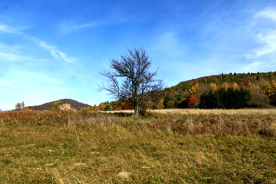 Najbliżej, po drugiej stronie doliny Ropy, Święta Góra Jawor z jej sanktuarium i cudownym źródełkiem. Hen w oddali, ponad doliną rzeki wznosi się masyw Chełmu nad Grybowem. Tuż pod granicą lasu, jest pod sosną ławeczka. To jedna z tych 50, jakie po górach ustawiło Studenckie Koło Przewodników Beskidzkich z Rzeszowa na swoje 50-lecie w 2020 roku. Warto przysiąść zanim wkroczymy w las.