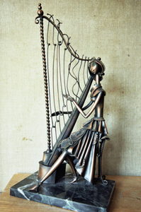 Na moją prośbę wykonał dużą serię „Muzyków”, którą zresztą kontynuuje w coraz ciekawszych formach. Niemal zawsze w sposób przynajmniej trochę odległy od realizmu, niekiedy jak gdyby prześmiewczy. „Harfistka” grająca tak brawurowo, że struny się plączą. „Basista” z symboliczną głową w postaci kuli i rękoma bez dłoni, z asymetrycznym instrumentem.