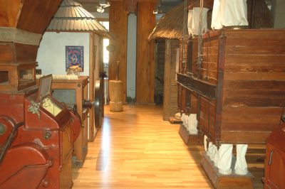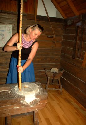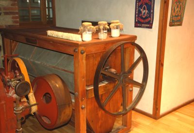 Każdy zwiedzający może bowiem, a nawet powinien, dotykać wszystkiego co jest w ekspozycji, przesuwać, włączać się w młyńskie prace, czy rozwiązywać multimedialne quizy w warsztatach rzemieślniczych. Także na piętrze, gdzie poznać można tajemnice żareckich rzemieślników − kołodzieja, szewca czy bednarza − i posłuchać historii żareckich rodzin. Wiele eksponatów, których sporo fotografuję, jest naprawdę ciekawych. Np. żarna, w których można samodzielnie mleć ziarna na mąkę. Czy ogromny bucior skórzano – wojłokowy o rozmiarach chyba półmetrowych, zarówno w długości podeszwy jaki i wysokości cholewki.