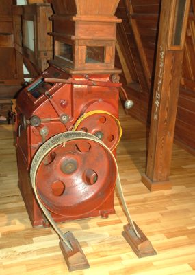 Zorganizowane zwiedzanie młyna, w którym uczestniczyłem, rozpoczyna film. Stary młynarz targuje się na nim z przyjeżdżającym z ziarnem Żydem, przy okazji wprowadzając turystów w realia miasteczka sprzed lat. Bohaterowie filmu dobijają targu, zboże trafia do młyna, a odwiedzający wchodzą na sale wystawowe. Dorośli mogą sprawdzić swoją znajomość zbóż, a dzieci szukać mysiej norki, zdobywać pieczątki, a nawet mleć ziarenka. Bohaterami drugiego filmiku są… gadające bochenki chleba. Parter wypełniają dawne urządzenia z możliwością aktywnego ich poznawania.